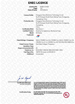 基本型微動(dòng)開(kāi)關(guān)ENEC證書(shū)